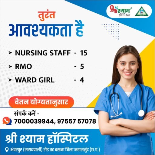 Job Alert Mahasamund: छत्तीसगढ़ के महासमुंद जिले में चिकित्सा क्षेत्र में रोजगार की तलाश कर रहे युवाओं के लिए अच्छी खबर है। भंवरपुर स्थित प्रतिष्ठित ‘श्री श्याम हॉस्पिटल’ (Shree Shyam Hospital) ने विभिन्न पदों पर भर्ती के लिए नोटिफिकेशन जारी किया है। अस्पताल को तुरंत अनुभवी और योग्य स्टाफ की आवश्यकता है।