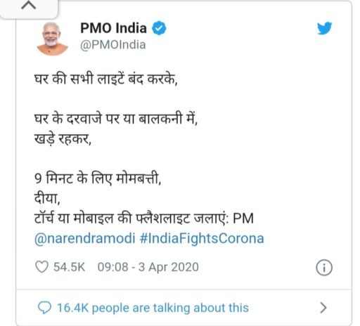 शुक्रवार सुबह जारी किए गए वीडियो संदेश में प्रधानमंत्री नरेंद्र मोदी ने देश के लिए नया आह्वान किया है। उन्होंने 5 अप्रैल को रात 9 बजे 9 मिनट के लिए कोरोना को चुनौती देने के लिए देश से वक्त मांगा है। उन्होंने कहा है कि सभी 130 करोड़ देशवासी रात में 9 बजे घरों की सभी लाइट को बंद कर 9 मिनट अपने घरों की बालकनी में एक दीया, टार्च की रोशनी या फिर मोबाइल की फ्लैश लाइट जलायें। ऐसा करके हम देश को ये संदेश दे सकता है कि कोरोना के खिलाफ जंग में कोई भी अकेला नहीं है। पूरा देश एक साथ खड़ा है। उन्होंने जनता को आगाह किया कि इस दौरान कोई भी सोशल डिस्टेंसिंग को नहीं तोड़े और कहीं एक जगह पर इकट्ठा ना हो। सभी अपने घरों में रहकर ये करें ।प्रधानमंत्री ने कहा किइस रविवार को हमें संदेश देना है कि हम सभी एक हैं. पीएम ने अपील करते हुए कहा कि इस दौरान सोशल डिस्टेंसिंग का उल्लंघन ना करें. इससे पहले उन्होंने अपनी शुरुआत में कहा कि कहा कि मेरे प्यारे देशवासियों, कोरोना वैश्विक महामारी के खिलाफ देशव्यापी लॉकडाउन को आज नौ दिन हो रहे हैं. इस दौरान आप सभी ने जिस प्रकार अनुशासन और सेवा भाव का परिचय दिया. शासन-प्रशासन और जनता जनार्दन ने इस स्थिति को अच्छे तरीके से संभालने का काम किया है.