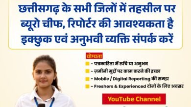 जाॅब: छत्तीसगढ़ के सभी जिलों में तहसील पर ब्यूरो चीफ, रिपोर्टर की आवश्यकता