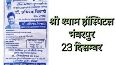 स्वास्थ्य सेवाएं@सरायपाली। श्री श्याम हॉस्पिटल भंवरपुर में कल दिनांक 23 दिसंबर को हड्डी रोग विशेषज्ञ उपलब्ध रहेंगे। श्री श्याम हॉस्पिटल…